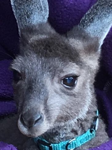 Ammy’s feet and tail were severely burnt in a bushfire. Her first treatments involved the vet removing the smelly, burnt flesh from her feet and cleaning the wounds. Under the vet’s instruction, her ongoing treatment included soaking the wounds in Betadine daily, applying lots of burn cream, and fresh bandaging. It was a long process, but Ammy was an excellent patient. She was content with a nice clean pouch, warm bottles of nutritious Wombaroo marsupial milk formula (specifically for roos), some yummy bush browse, muesli, and—of course—plenty of love and cuddles.